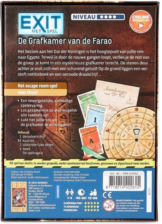 Het uitdagende co?peratieve escape room-spel! Ontsnap zo snel mogelijk uit de griezelige grafkamer. Probeer binnen anderhalf uur alle puzzels op te lossen en alle codes te breken. Alleen dan ontsnappen jullie uit de locatie waar jullie opgesloten zitten. Logisch nadenken en doorzettingsvermogen zijn vereist om dit spel tot een goed einde te brengen. En komen jullie er echt niet uit, dan bevat het spel tipkaarten om jullie op het goede spoor te brengen. EXIT: De Grafkamer van de Farao is maar ??n keer speelbaar omdat het speelmateriaal moet worden beschreven, gevouwen of afgescheurd. Maar net als in een echte escape room garanderen we een zeer intense puzzel- en speelervaring! De puzzels zijn vrij pittig. Daardoor is het spel vooral geschikt voor fervente puzzelaars en escape room-liefhebbers. Niveau: professional