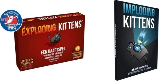 Imploding Kittens bestaat uit 20 nieuwe kaarten, waardoor 6 nieuwe type acties kunnen worden uitgevoerd. Bovendien is er 1 imploderende kitten die ervoor zorgt dat het spel met 6 spelers gespeeld kan worden. Ook bevat het een levensgrote ?Schaamkraag?. Is een speler niet aan het opletten? Dan mag hij zich schamen met de Schaamkraag. De kaarten zijn wederom voorzien van hilarisch illustraties gemaakt door The Oatmeal.