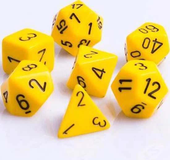 Polydice dobbelstenenset voor al jouw Roll Playing Games (RPG), zoals D&D, Pathfinder of bijvoorbeeld Force and Destiny. Een Polydice-set bestaat 7 verschillende dobbelstenen ??n van elk: D20, D12, D10 (met tientallen), D10 (0-9), D8, D6 en een D4. Door gebruik te maken van een set voor elke speler verloopt jouw RPG vlotter. Polydice 7 Dobbelstenenset maat is 16mm, wat een ?gewoon? formaat dobbelstenen is. De kleur van de dobbelstenen is geel met zwart cijfers.