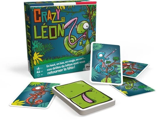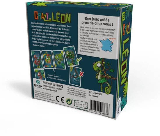 Les cam?l?ons ne retrouvent plus leur chemin dans la jungle ! Pour les aider, d?barrassez-vous de toutes vos cartes pour faire avancer les cam?l?ons de liane en liane, sans d?passer la zone de jeu impos?e. Mais attention, les cam?l?ons sont devenus fous ! Ils changent de couleurs et de direction sans pr?venir… Restez vigilants ? ne pas sortir de la jungle ! Des cartes Joker vous permettrons de pi?ger les autres joueurs (et de vous sauver !) en vous donnant la possibilit? de changer la couleur demand?e, la direction ou les deux. Un jeu familial qui plaira aux plus jeunes.