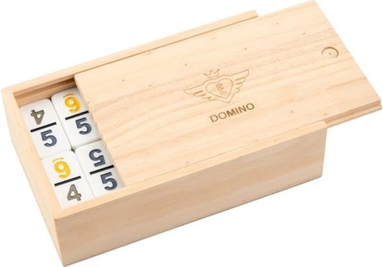 Dit makkelijk te spelen dominospel met cijfers is van topkwaliteit en zit goed verpakt in een houten kist met schuifdeksel.
