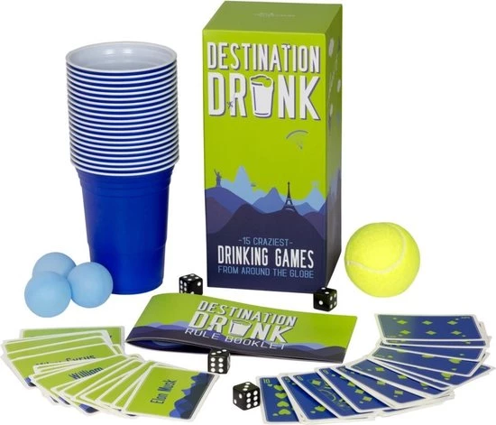 Destination Drunk drankspelletjes van Gutter Games. Doos met vijftien grappige drankspelletjes uit Duitsland, Engeland, Rusland, Frankrijk, Spanje en meer landen. Speldoos met vijftien spellen voor twee tot twintig persoon. Je hebt alleen nog bier en vrienden nodig. Bevat alle benodigdheden, zoals bekers, dobbelstenen, een tennisbal en natuurlijk de spelregels. Leuke doos met drankspellen voor feesten, bachelor parties of voor op vakantie.