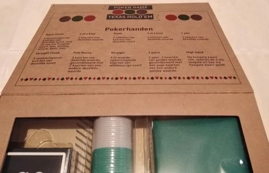 | Verpakkingsinhoud | Poker, game, set, Texas, hold'em, vanaf, 6, jaar<br, />inhoud, van, doos<br, />1, set, kaarten<br, />50, chips<br, />pokerkleed, en, spelinstructie |