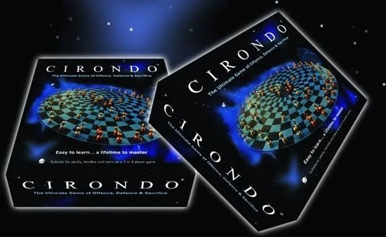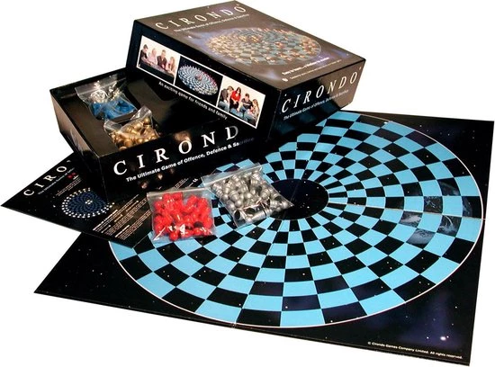 Cirondo bord-spel. Het ultieme spel met slechts 3 verschillende stukken, 3 bewegingen en onuitputtelijk veel mogelijkheden. Gespeeld op een rond bord is het doel van het spel om je tegenstanders te elimineren terwijl je in gedachten houdt dat het draait om aanvallen, verdedigen en opofferen. De bedoeling is om per beurt ??n stap vooruit te doen met je manen, terwijl je deze verdedigd met uw planeten en strategie?n opzet om je tegenstanders sterrenstelsels aan te vallen. Zodra de maan de binnenste ring bereikt wordt deze meegezogen in het zwarte gat en keert het terug voor een zonnestelsel. De zonnestelsels zijn de meest krachtige stukken die elke speler kan verkrijgen. De planeten zijn verdedigende stukken die alleen in rondes over het bord kan bewegen. Het spel is gemakkelijk te leren. Uitgevoerd met metalen speelstukken. Speel Cirondo met 2 of 4 spelers of twee teams van 2 spelers. Spelregels in Engels en Nederlands.