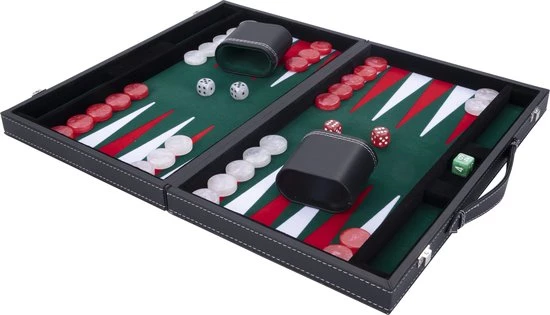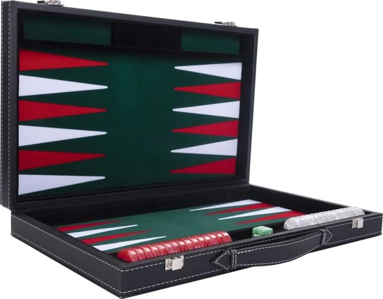 Longfield Backgammon 15″inch groen, rood en wit ingelegd vilt in leren koffer.