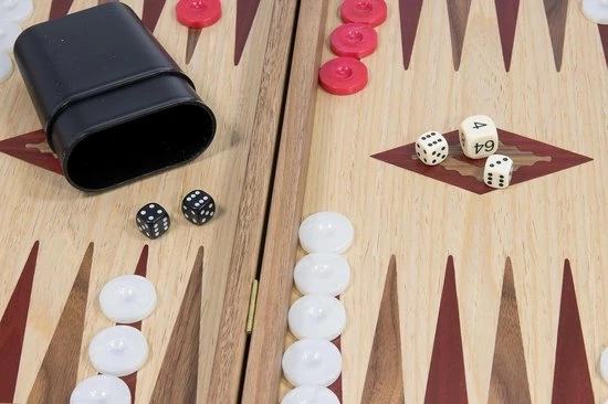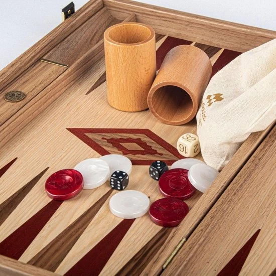 De Eik is een van de meest geliefde bomen ter wereld, en terecht. Het staat symbool voor kracht, moreel, weerstand en kennis. Het speelveld is een combinatie van prachtig eiken met walniut & rode kleurpunten. Dit backgammon bord met zijrekken is verkrijgbaar in 2 maten.