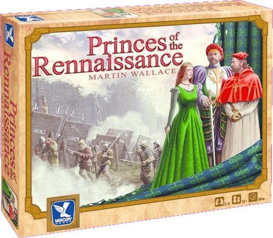 Princes of the Renaissance is set in Renaissance Italy. Each player takes on the role of one of the minor Condottiere princes, such as the Gonzagas or d’Estes. Then there are the big five major cities: Venice, Milan, Florence, Rome, and Naples. These are not controlled by individual players, but players will gain ‘interests’ in them as the game progresses. Each city has six tiles, most of which represent a famous character such as Lucrezia Borgia or Lorenzo Medici. Each tile has its own special properties that are linked to the character on the tile. Thus Cesare Borgia will help you to become more treacherous, while a Venetian merchant will increase your income. These tiles are also worth victory points, depending on the status of the city at the end of the game.