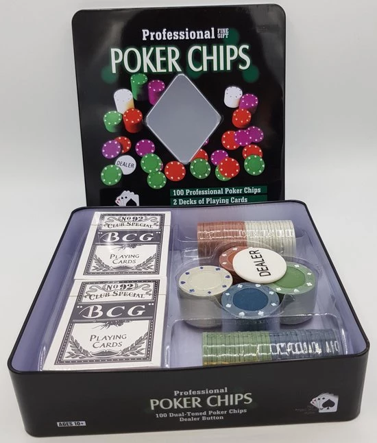 | Verpakkingsinhoud | 1, metaal, doos, zit, 100, stuks, Poker, chips, 1, stuk, Deal, Button, en, 2, speelkaarten. |