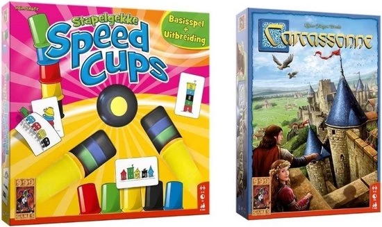 Stapelgekke Speedcups – 6 spelers Je krijgt 5 bekers in verschillende kleuren. Elke ronde draait een speler de bovenste kaart van de stapel om. Daarop staan 5 voorwerpen in de kleuren van de bekers horizontaal of verticaal geori?nteerd. Zo kunnen er 5 vogels in een boom zitten of 5 shirts aan een waslijn. Je probeert nu zo snel mogelijk je bekers op of naast elkaar te zetten op de manier waarop dit op de kaart is aangegeven. Ben je als eerste klaar, druk dan snel op de bel. Heb je het goed, dan win je de kaart. De speler met de meeste kaarten wint het spel. Zorg dus dat je rustig, maar tegelijkertijd gefocust bent. Dan maak je de minste fouten en gooi je niet per ongeluk je stapel om. Stapelgekke Speed Cups heeft zeer eenvoudige spelregels, waardoor het snel te leren is. Leuk voor families met kinderen, maar ook voor studenten en veelspelers die iets luchtigs tussendoor willen doen. In deze versie zitten het basisspel en de uitbreiding in ??n doos.