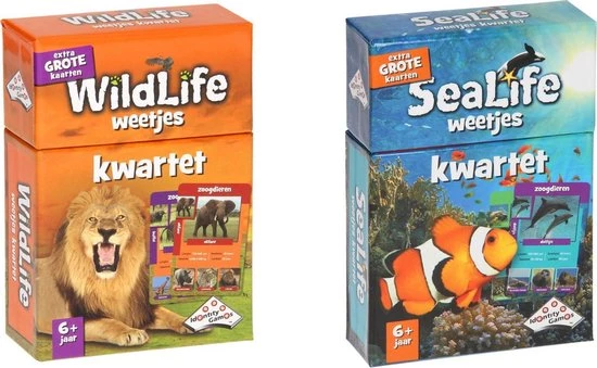 Dit weetjes kwartet is niet alleen een leuk spel.. het is ook nog erg leerzaam. Het Sealife Weetjeskwartet gaat over de dieren uit zee?n en oceanen, afgebeeld op extra grote kaarten.Op deze kaarten staan foto’s en ook nog eens interessante weetjes! Met een superkwartet van 5 kaarten! Hoe oud kan een dolfijn worden? Hoe snel kan een inktvis zwemmen? Hoe zwaar kan een walvis worden?
