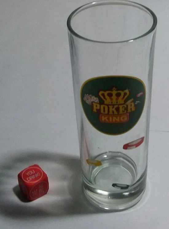Longdrinkglas met de opdruk : Poker King en fichesprint. Inclusief een dobbelsteen met teksten, zoals: I drink, We drink, You drink.