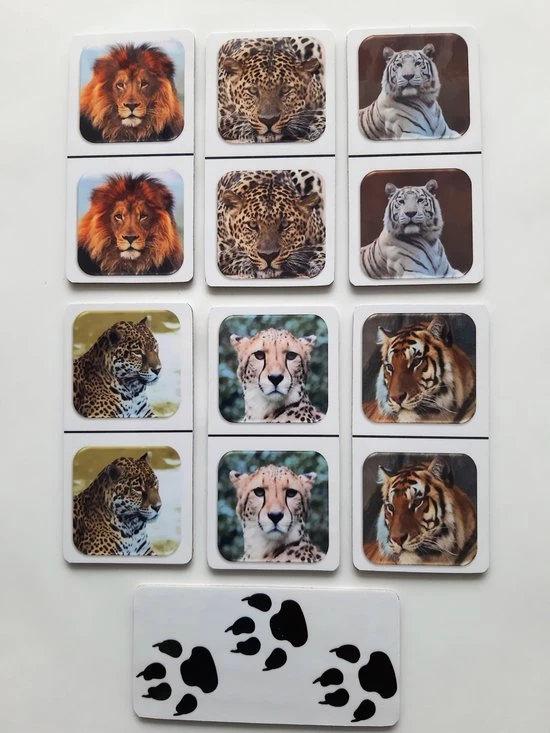 FotoDomino Katachtigen is speciaal gemaakt voor ouderen en voor mensen met een hersenaandoening zoals bijvoorbeeld dementie. Het spel bestaan uit 28 grote kaarten van 6-12cm, aan beide zijdes voorzien van een lamineerlaag zodat de kaarten afneembaar zijn. Ze zijn ongeveer 3 mm dik, zodat ook gespeeld kan worden met mensen waarbij de fijne motoriek niet meer is wat het zou moeten zijn.