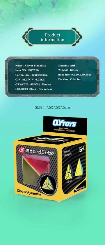 De QiYi Clover Pyraminx heeft de vorm van een traditionele pyraminx, maar daar houden de overeenkomsten op. Dit is een baanbrekende kubus ! Bovendien beweegt deze kubus door elkaar en verandert de vorm, wat leidt tot interessante, verbluffende combinaties en bewegingen.