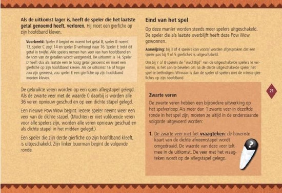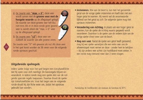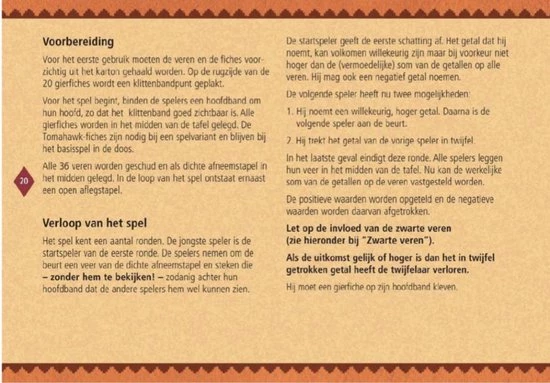| Verpakkingsinhoud | 8, hoofdbanden, 20, klittenbandstickers, 36, veren, 20, gier-fiches, 8, tomahawk-fiches |