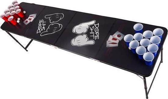 Een eigen Beer Pong Tafel met de offici?le afmetingen 240cm x 60cm x 70cm. Als je er 1 wilt, dan wil je natuurlijk de allerbeste kwaliteit. Deze Beer Pong Tafel is voorzien van het waterbestendige Dope Design. De gehele tafel klap je gemakkelijk in elkaar als handig koffertje, het koffertje is meteen draagbaar, inclusief handvat. Zo kan het overal meegenomen worden en ook makkelijk bewaard worden.