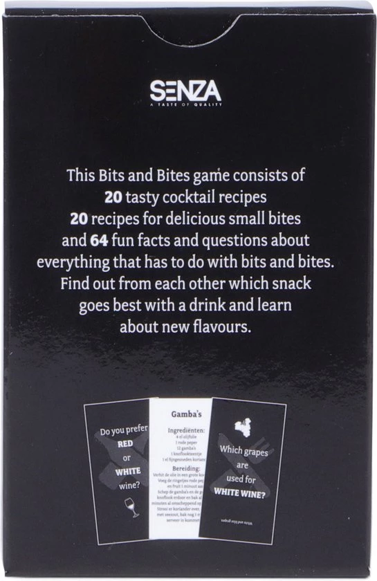 Dit borrelspel is het ideale spel voor leuke gesprekken of tijdens het borrelen. Dit borrelspel bevat 20 lekkere cocktailrecepten, 20 verrukkelijke borrelrecepten en 64 leuke feitjes en vragen over alles wat met borrelen te maken heeft. Ontdek van elkaar welk hapje er het best bij de borrel past en leer nieuwe smaken kennen.