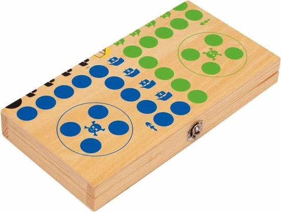 Een stoutmoedig fraaie uitvoering van een van de leukste gezelschapsspelen in handige houten box. Vrolijk kleurige piraten treden hier tegen elkaar aan. Met cijferdobbelsteen (1 – 6), zo kunnen de kleine vrijbuiters hun stappen nog sneller herkennen.