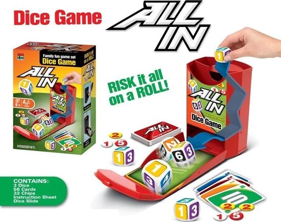 Het is een spel van getallen en zenuwen als je deal, duel en misleid je weg naar de cirkel van de winnaar! Spelers gebruiken kaarten, dobbelstenen en fiches om de waarde van een kaart te laten komen, ??n tot 13. later begint het gokken en bluffen. De speler die het dichtst bij het aantal is wint de ronde en de fiches in de pot. Heb je niet genoeg fiches om een weddenschap te behalen? Het is tijd om “All In” te gaan en vooraf je voorraad fiches aan te vullen. De speler met de meeste fiches aan het einde van het spel is de winnaar. Deze eenvoudige te leren game is gedeeltelijk poker, second voorspellen en een deel puur geluk! Bevat All In-kaarten, drie dobbelstenen, chips spelen, dobbelsteenglijbaan en instructies.