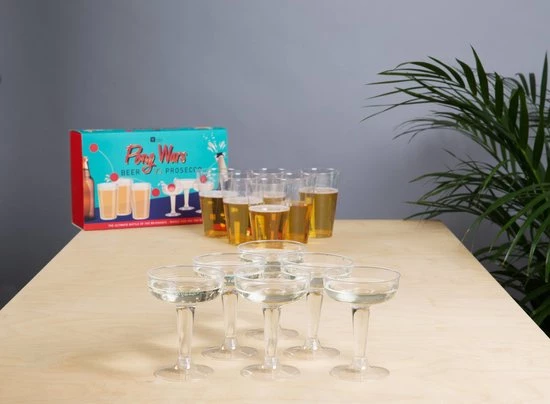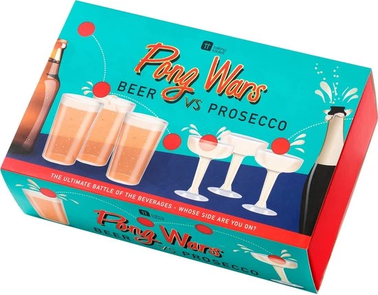 Laat de spellen maar beginnen in deze ultieme strijd om de dranken! Of je nu de voorkeur geeft aan bier of prosecco, kies een kant, verzamel je teamgenoten en laat het feest beginnen! Een variant op het klassieke bierpongspel, spelers splitsen zich in teams en aan tegenovergestelde uiteinden van een tafel en proberen de pingpongballen in de bril van hun tegenstanders te laten stuiteren.