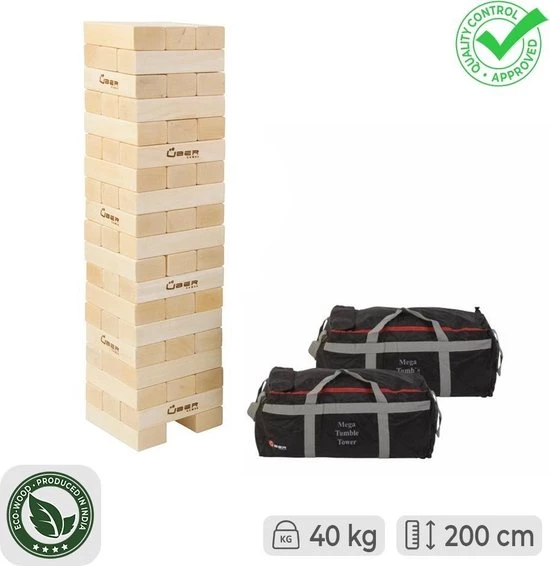 Mega groot, Mega geweldig. Dit traditionele spel maar dan in nog grotere afmetingen. Door de hoge kwaliteit van de 56 blokken kunt u een toren bouwen van 19 verdiepingen en 124 cm hoog. Daarna begint het spel. De bedoeling is een blok uit de stapel te halen en deze bovenop te leggen. Hierdoor kan de toren tot meer dan 200 cm hoog worden. Als de toren valt heeft u verloren.