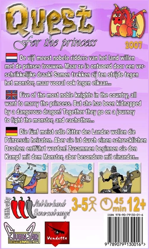 Ridders strijden in dit leuke kaartspel om de hand van de prinses, en sloven zich enorm uit!3-5 spelers, 12+Quest for the princess is een kaartspel voor 3 tot 5 ridders en duurt ongeveer 45 minuten. De ridders gaan op een gezamenlijke quest om de prinses van de draak te bevrijden zodat ze met haar kunnen trouwen. Haar alleen redden is echter niet genoeg: ze moeten ook nog eens de andere ridders bevechten en proberen in de smaak te vallen bij de koninklijke schoonfamilie. Dit alles voor punten.