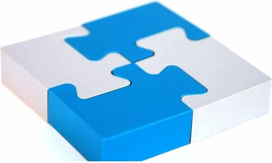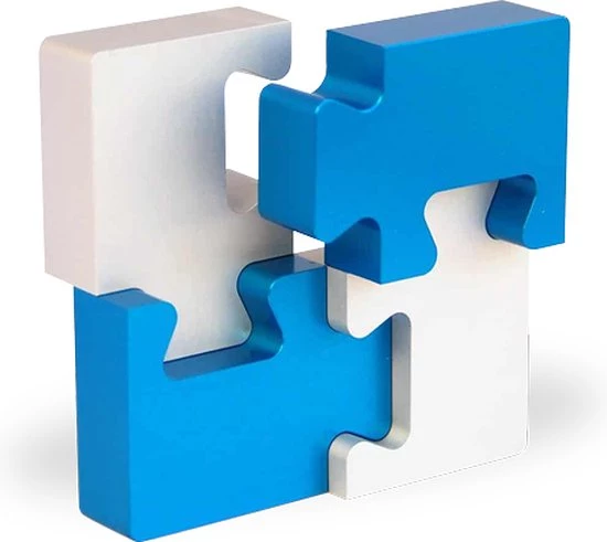 Deze metalen puzzel van de uitvinder Wil Strijbos is van hoge kwaliteit, met prachtige blauwe en zilveren stukjes. Het doel is om de vier puzzelstukjes uit elkaar te halen en weer in elkaar te zetten. Je hebt wat handigheid nodig om deze weer bij elkaar te krijgen.